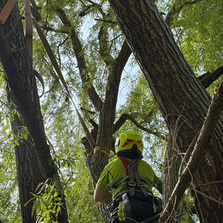 Es handelt sich um eine große Weide, welche in der Mitte des Hauptstammes einen großen Riss aufwies und dadurch in 2 Teile auseinander zu fallen drohte. Durch den Stammriss konnte man schon Licht durchschimmern sehen. Da eine Hälfte der langen Austriebe, noch dazu in der Hauptwindrichtung, über das Dach der Nachbarliegenschaft ragte und im Falle eines weiterreissens auf dieses fallen könnte, wurden provisorische Kronensicherungen mit Zurrgurte eingebaut. Damit sollte kurzfristig die Gefahr gebannt sein.