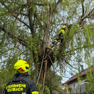 Die Hausbesitzer hatten schon selbst notdürftig Sicherungsmaßnahmen durchgeführt, aber aufgrund des angesagten Wetterberichtes und Verschlechterung des Gesamtzustandes des Baumes wurde Sicherheitshalber die Feuerwehr gerufen.